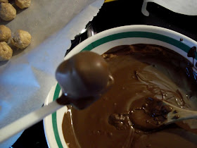 I do not have a set size on the peanut butter balls. You do not want them too big because they are a very rich chocolate. So probably as big as a Atomic fireball. hehehe. I have a two cookie sheet system. Line both of them with either waxed or parchment paper (I am partial to parchment). Form a batch of 20 or so and pop that sheet in the freezer. The other cookie sheet is going to be for the balls that have been covered in chocolate. Let them sit in the freezer for about 10-15 minutes.