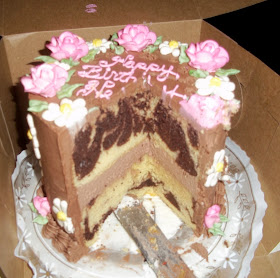 This is my birthday cake. It is small and tall. Looks yummy huh? I had a piece last night and I will have a piece tonite and that will be it for me. I can only do so much of the rich sweet stuff.