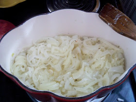 Yesterday I made some French Onion soup. It is a favorite of Fred's and mine but we do not have it very often. We will usually have it when we go out to eat at certain places that make it well, like Steak Loft. It is a long cooking process but it is worth it because it can be a labor of love. If you love this soup and you love someone who loves this soup, take a day to make it for them. It will show them a tiny bit of how you feel. Plus, you gotta love each other cause you are gonna REEK of onions afterward. :)