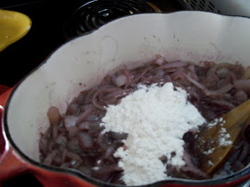 Add the flour in at this point and mix it completely in. Cook this on low for 10 minutes. You are cooking the flour at this point. You do not have to sit on top of it but do not stray far. Give it some stirs once in awhile. After the 10 minutes you are going to add in the broth. Stupid me forgot to take a picture. I put the dutch oven on the back burner of the stove. I cooked in on low for 2 1/2-3 hours. Low and Slow. It is going to reduce and it is going to be yummy. If you want to cook it longer, go ahead. It will not hurt it. Just keep an eye on it. Your whole house is going to smell like onions, garlic, and thyme.
